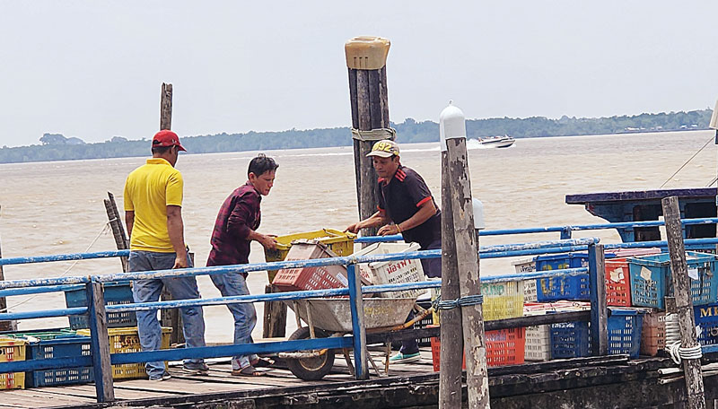 Petugas melakukan aktivitas bongkar mangga hasil tangkapan dari salah satu kapal saat di Pelabuhan Pos KPPBC Bengkalis, Jalan Ahmad Yani, Selatpanjang, awal pekan lalu. (wira saputra/riaupos.co)