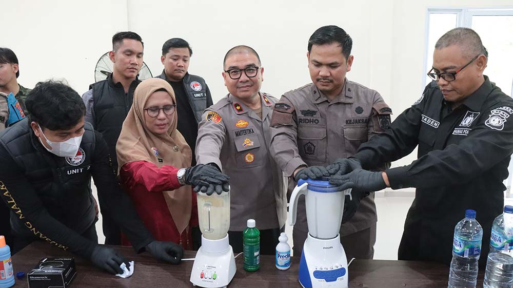 ajaran Polres Kepulauan Meranti bersama pihak terkait memusnahkan barang bukti 1,3 Kg sabu dan 50 butir ekstasi dengan cara memblender, Jumat (24/1/2025) pagi. (WIRA SAPUTRA/RIAU POS)