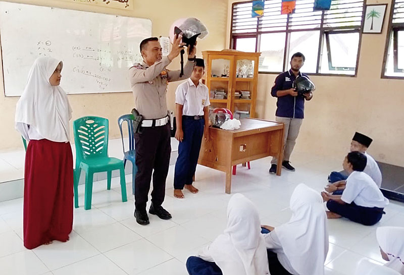 Personel Satlantas Polres Kuansing Aiptu Mastur memberikan contoh pemakaian helm yang benar kepada murid SD dan SMP Kecamatan Gunung Toar, Senin (1/4/2024). (SAT LANTAS POLRES KUANSING UNTUK RIAUPOS.CO)