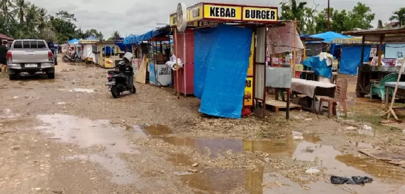 Lokasi relokasi pedagang kaki lima di kawasan Pasar Lumpur Telukkuantan, becek dan berlumpur saat hujan dua hari ini di wilayah Kabupaten Kuansing, seperti Ahad (7/9/2025). (Desriandi Candra/Riaupos.co)