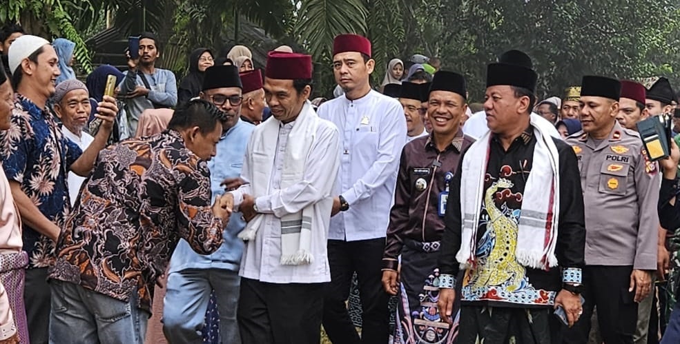 S: Bupati Kuansing Dr H Suhardiman Amby bersama Ustadz Abdul Somad (UAS), disambut masyarakat Kecamatan Pulau Panjang Hulu, Inuman, saat meresmikan Pondok Pesantren Imam Saleh, Sabtu (9/8/2025).DESRIANDI CANDRA/RIAU POS