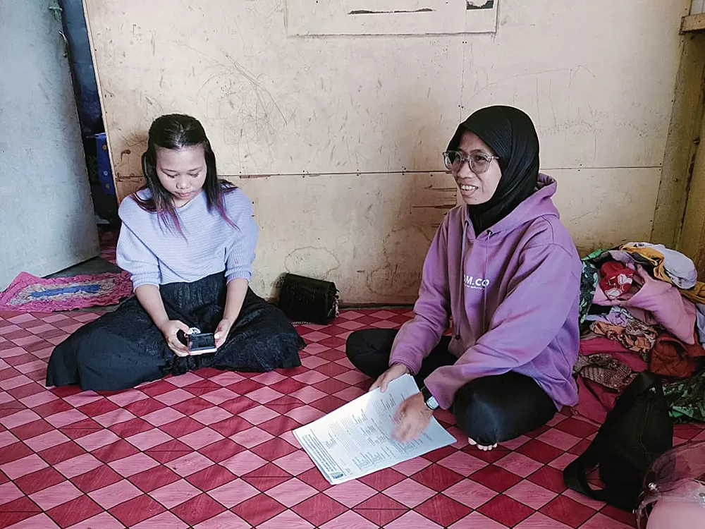 Kepala UPTD PPA Dinas DP2KBP3A Kuansing Bonita (kanan) mengunjungi ibu korban kasus kekerasan anak, Sabtu (14/6/2025). (Dinas P2KBP3A Kuansing)