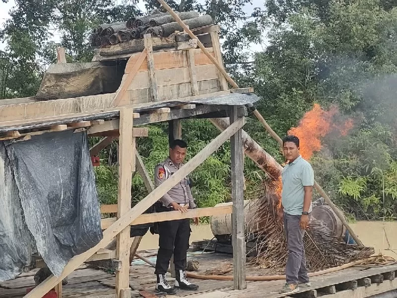 Personel Polsek Benai merazia lokasi penambangan emas tanpa izin (PETI) di Gunung Kesiangan, Selasa (17/12/2024). Sebanyak lima rakit PETI pun dibakar aparat. (Humas Polres Kuansing)
