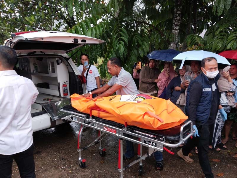 Petugas kepolisian saat mengevakuasi jenazah Juniwarti untuk dibawa ke RSUD Telukkuantan, Senin (24/2/2025).