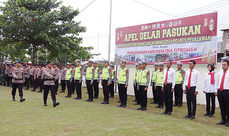 Kapolres Pelalawan AKBP Suwinto SH SIK memeriksa pasukan dalam apel gelar pasukan Operasi Ketupat Lancang Kuning 2024 di Pangkalankerinci, Rabu (3/4/2024). (m amin/riaupos.co)