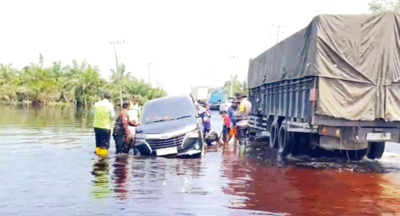 PANGKALANKERINCI (RIAUPOS.CO) – Tinggi air yang merendam Jalan Lintas Timur (Jalintim) Sumatera Km 83 Desa Kemang, Kecamatan Pangkalan Kuras, Kabupaten Pelalawan tinggal 30 sentimeter (cm), Ahad (11/2). Semua kendaraan sudah dibolehkan melintasi.