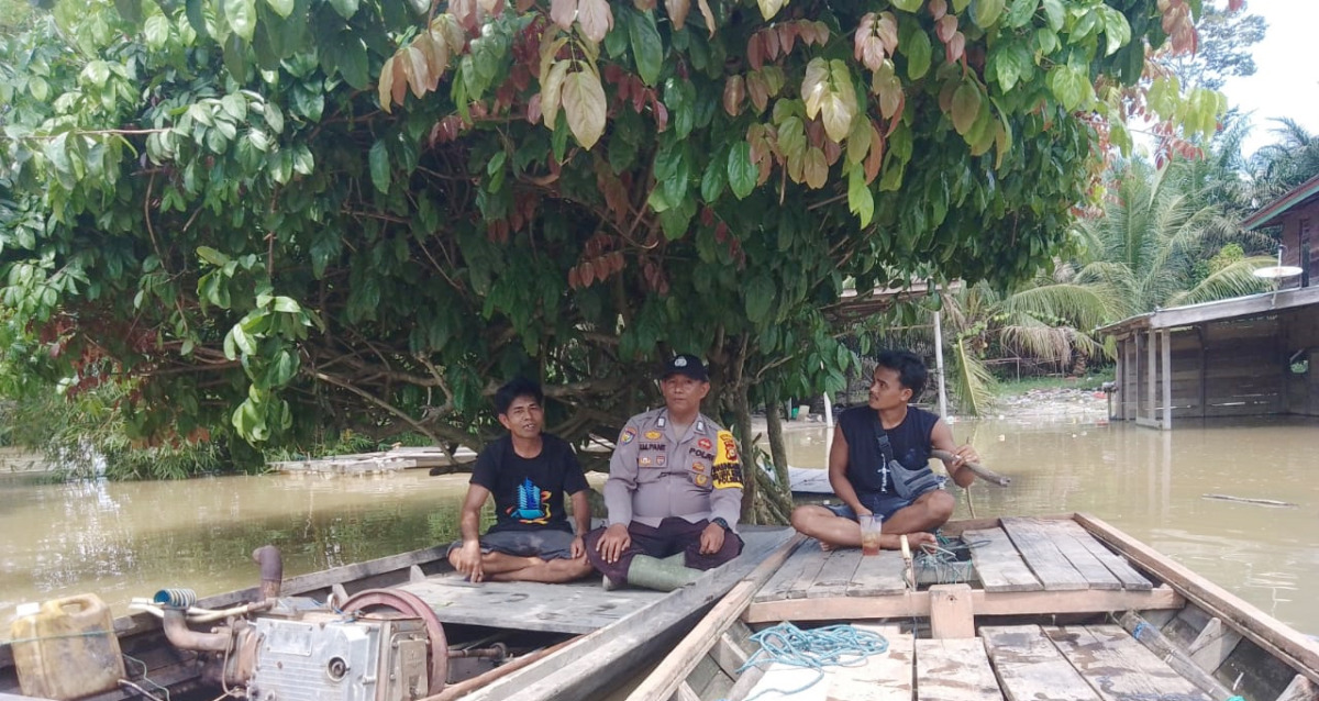 Di tengah suasana yang tenang dan penuh kehati-hatian, Bripka Inder M Pane terlihat berdialog dengan dua orang warga yang kebetulan juga berada di atas perahu.