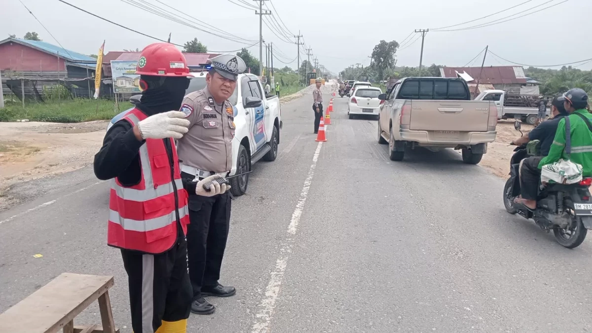 Personel Satlantas Polres Pelalawan melakukan pengaturan lalu lintas saat penerapan sistem buka tutup di Jalan Lintas Timur Km 75 Pangkalankerinci, Pelalawan, Kamis (19/2/2026). (MUHAMMAD AMIN AMRAN)