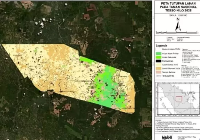 Peta kawasan TNTN. Warna hijau menunjukkan 12.561 hektare hutan alam yang tersisa atau 15,36 persen dari total luasnya yang mencapai 81.793 hektare. (Dokumen Walhi Riau untuk Riaupos.co)