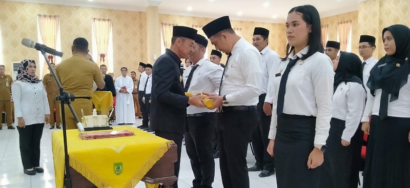 BAGANSIAPIAPI (RIAUPOS.CO) – Bupati Rokan Hilir (Rohil) Afrizal Sintong secara simbolis menyerahkan SK bagi Pegawai Negeri Sipil (PNS) formasi tahun 2021 yang digelar di Bagansiapiapi, Selasa (6/2). Kegiatan itu turut diwarnai dengan pengambilan sumpah serta pelantikan jabatan fungsional tertentu di lingkungan Pemkab Rohil.