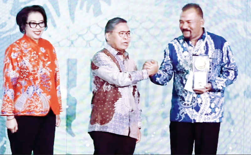 Kepala DLH Rohil Suwandi SSos menerima penghargaan Adipura, atas dinobatkannya Bagansiapiapi sebagai kota kecil terbersih, di Jakarta, baru-baru ini. (Diskominfotiks Rohil untuk riaupos.co)