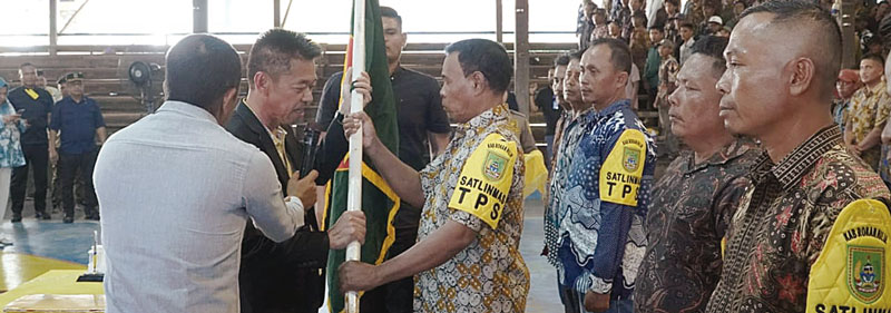 Bupati Rohil Afrizal Sintong MSi mengukuhkan Satlinmas pengamanan Pemilu 2024 di aula Perguruan Wahidin, Bagansiapiapi, Senin (12/2/2024). (diskominfotiks Rohil untuk riau pos)