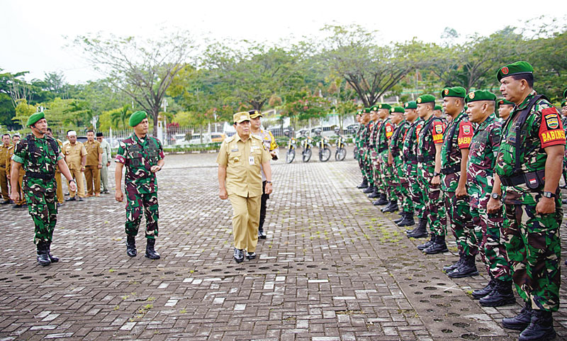 Bupati Rohul H Sukiman didampingi Forkopimda Rohul, memeriksa barisan saat memimpin apel bersama tiga pilar dalam rangka persiapan pengamanan Pemilu Serentak 2024 di halaman Kantor Bupati Rohul, Jumat (2/2/2024).(Foto Prokopim Setda Rohul untuk Riaupos.co)
