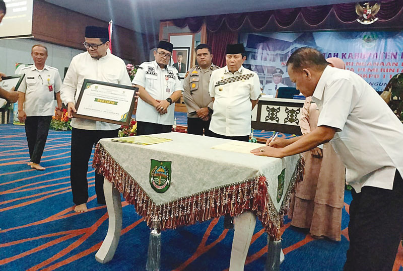 Bupati Rohul H Sukiman menyaksikan penandatanganan berita acara hasil kesepakatan Musrenbang RKPD Rohul Tahun 2025 di Convention Hall Islamic Center Pasirpengaraian oleh Kepala Bappeda Rohul Drs H Yusmar MSi (kanan), Rabu (3/4/2024). (Engki Prima Putra riaupos.co)