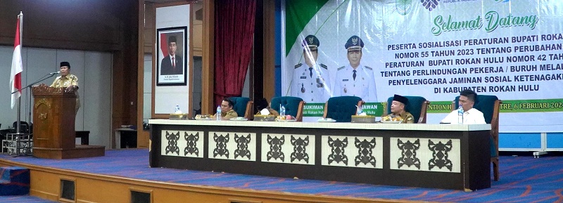 ‘’Untuk hal ini, Pemkab telah menerbitkan Peraturan Bupati (Perbub) Rohul Nomor 55 Tahun 2023 tentang Perubahan atas Peraturan Bupati Rohul Nomor 42 Tahun 2021 tentang perlindungan pekerja atau buruh melalui BPJS Ketenagakerjaan di Kabupaten Rohul,’’ ungkap Bupati Rohul H Sukiman, usai membuka sosialisasi Perbup Nomor 55 Tahun 2023 di Convention Hall Islamic Center, Selasa (6/2).