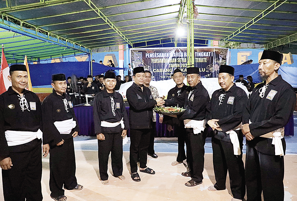 MENERIMA BUBUR: Wabup Rohul H Syafaruddin Poti SH MM didampingi Ketua PSHT Cabang Rohul Munandar SE MM (kiri) menerima bubur suro dari Koordinator Dewan Pengesah PSHT Pusat Madiun Wardoyo dalam acara pengesahan warga baru tingkat I PSHT di Tribun Jaya Negara, Desa Rambah Muda, Kecamatan Rambah Hilir, Ahad (6/7/2025) malam. (Prokopim Setda Rohul Untuk Riau Pos)