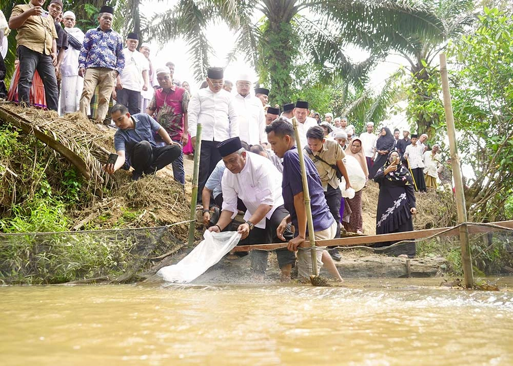 Bupati Rohul Anton ST MM menebarkan ribuan bibit ikan secara simbolis di Sungai Lubuk Larangan yang berada di Surau Suluk Al-Muqorrobah Desa Kabun, Kecamatan Kabun, Sabtu (7/2/2026) siang. Prokopim Setda Rohul untuk Riau Pos