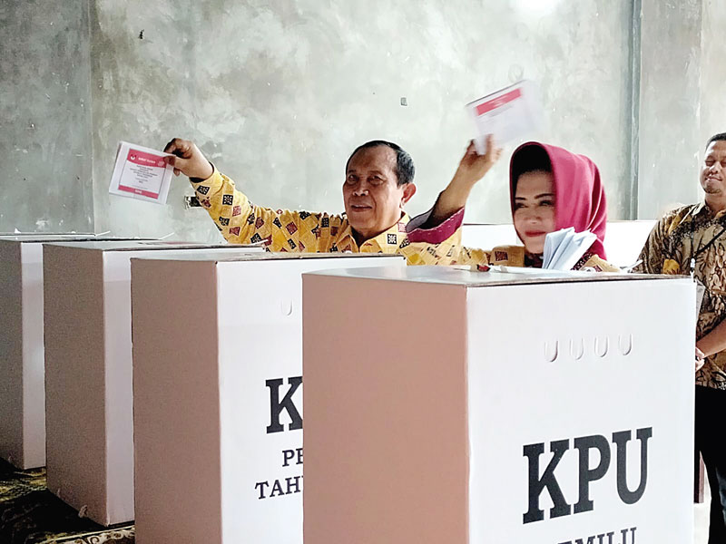 Bupati Rohul H Sukiman bersama istri Hj Peni Herawati Sukiman menyalurkan hak pilihnya pada Pemilu Serentak di TPS 20, Dusun Pematang Baih, Desa Pematang Berangan, Kecamatan Rambah, Rabu (14/2/2024). (Engki Prima Putra/riau pos)