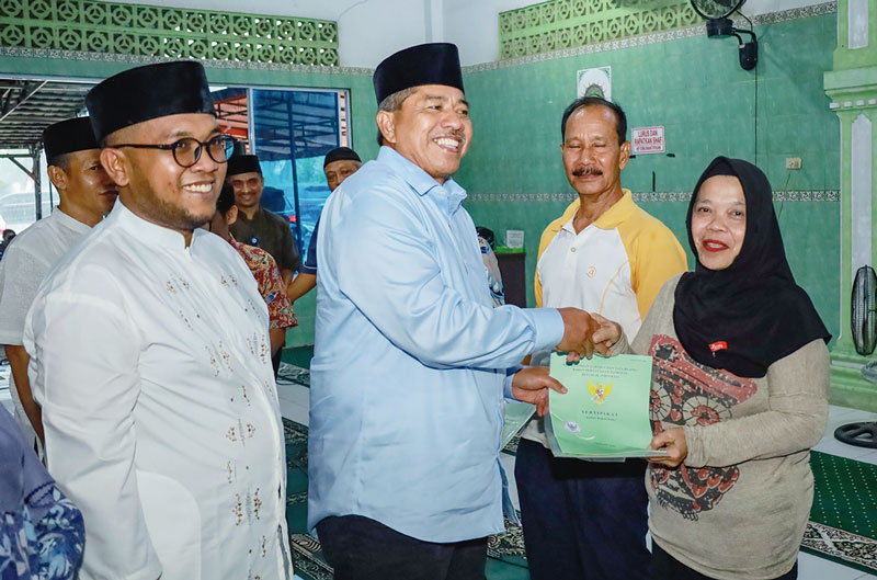 RIAUPOS.CO – Bupati Siak Drs H Alfedri MSi kembali menyerahkan 212 sertifikat tanah kepada warga di Masjid Al-Hijrah, Kelurahan Minas Jaya, Kecamatan Minas, Kabupaten Siak, Jumat (29/3).