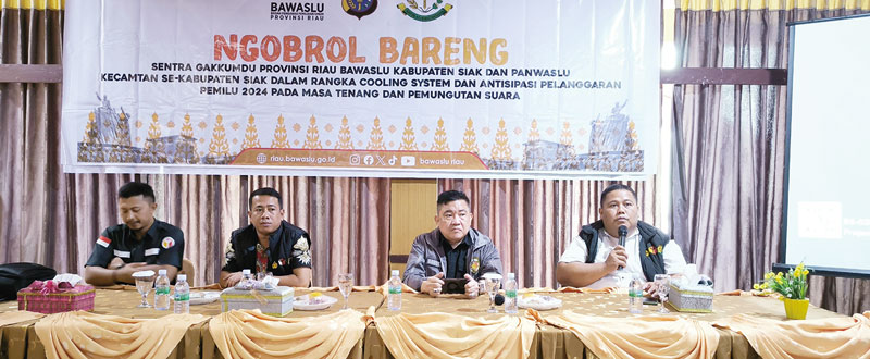 Sentra Gakkumdu Riau yang terdiri dari unsur Bawaslu Riau diwakili Anggota Bawaslu Riau Koordinator Divisi Penanganan Pelanggaran, Data dan Informasi Nanang Wartono dan dari unsur Kepolisian Daerah Riau dihadiri Kasubdit I Ditreskrimum Polda Riau AKBP Darul Qotni, melakukan sosialisasi pencegahan pelanggaran Pemilu Tahun 2024 kepada pengawas Pemilu se-Kabupaten Siak.