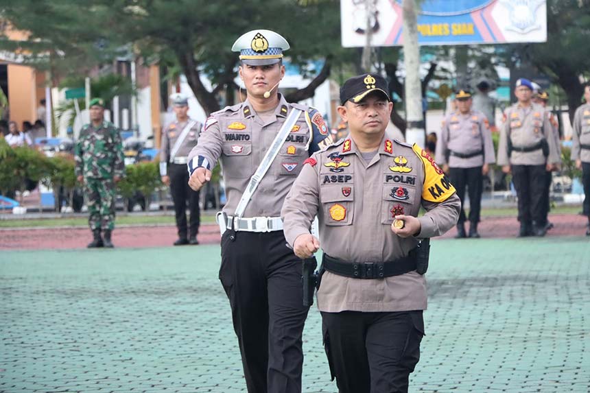 Kapolres Siak AKBP Asep Sujarwadi SIK MSi memimpin apel gelar pasukan Operasi Ketupat Lancang Kuning 2024. Kapolres Asep membacakan sambutan tertulis Kepala Kepolisian Republik Indonesia Jenderal Polisi Listyo Sigit Prabowo.