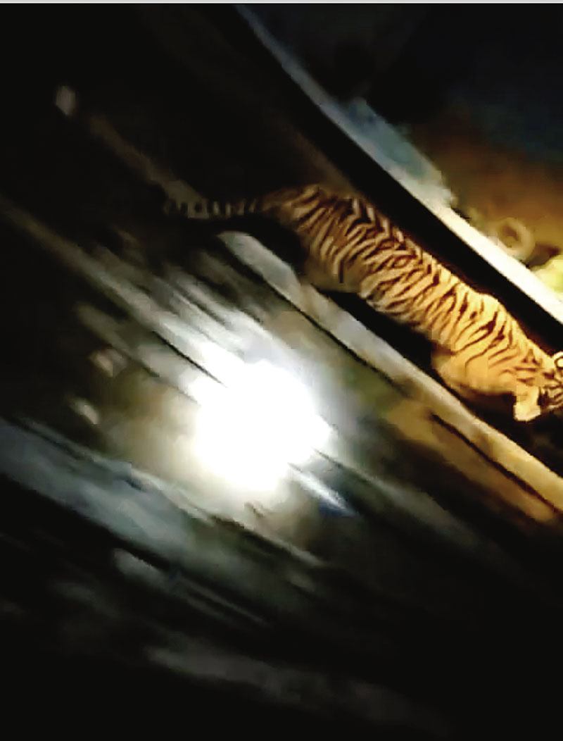 Hal itu menimbulkan kecurigaan Aheng dan tiga rekannya. Dengan menggunakan senter, Aheng mengarahkan senter ke bawah sehingga terlihatlah harimau mengelilingi bangunan, lalu hilir mudik di depan pintu di tengah gonggongan anjing. “Lalu Aheng merekam dan temannya menyenter harimau,” terang Kapolsek Rinaldi. Sinar senter membuat harimau pergi dan masuk ke dalam hutan. Selanjutnya, setelah menenangkan diri, pada pukul 19.00 WIB, Aheng menghubungi Kepala Dusun Mungkal bernama Ali Zona alias Akiong, sekaligus mengirimkan video penampakan harimau itu.