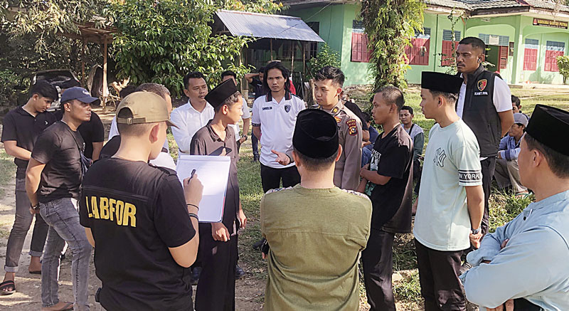 Tim Labfor meminta keterangan ke sejumlah santri Pondok Pesantren (Ponpes) Nurul Yakin di Kampung Dayun, Kecamatan Dayun, Senin (19/2/2024). (monang lubis/riau pos)