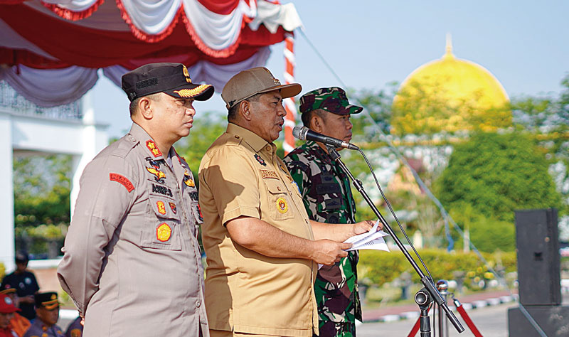 PIMPIN APEL: Bupati Siak Alfedri, Kapolres AKBP Asep Sujarwadi, Dandim 0322/Siak Letkol Arh Riyanto Budi Nugroho memimpin apel siaga darurat karhutla di halaman Kantor Bupati Siak, Senin (18/3/2024). (diskominfo siak untuk riau pos)