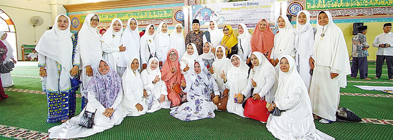 Wabup Siak Husni Merza dan istri Ananda Laila Putri foto bersama dengan Majelis Taklim se-Kecamatan Kampar Utara di Masjid Sultan Syarif Hasyim, Kompleks Islamic Center, Kecamatan Siak, Ahad (18/2/2024). (kominfo siak untuk riaupos.co)