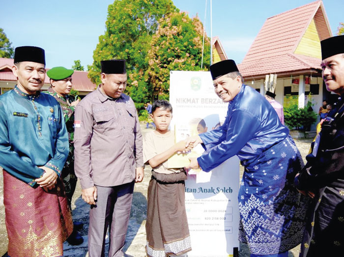 Bupati Siak Alfedri menyerahkan bantuan dalam Program Bujang Kampung di Teluk Masjid, Kecamatan Sungai Apit, Siak, Jumat (19/4/2024). (DISKOMINFO SIAK UTUK RIAU POS_