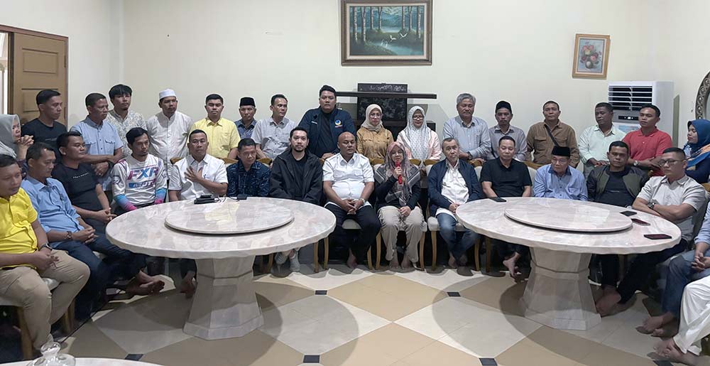 Pasangan Calon Bupati dan Wakil Bupati Siak, Afni Z dan Syamsurizal, melakukan konferensi pers bersama Ketua Golkar Riau H Syamsuar, Ketua Tim Pemenangan yang juga Ketua DPRD Siak Indra Gunawan, dan tim partai koalisi, di kediaman Ketua DPRD Jalan Raja Kecik Kota Siak, Sabtu (22/3/2025). Monang lubis/riau pos