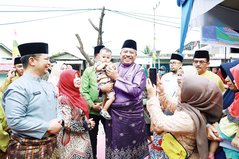 Bupati Siak Alfedri didampingi Kadiskes dr Benny menggendong balita sambil menyerahkan bantuan paket dari PT BSP saat Bujang Kampung ke-100 di Kelurahan Perawang, Kecamatan Tualang, Jumat (8/3/2024). (diskominfo siak untuk riaupos.co)