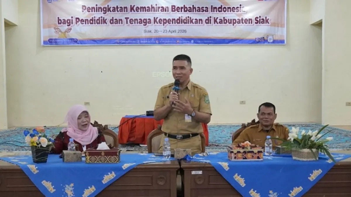 Hal tersebut disampaikannya saat membuka kegiatan Peningkatan Kemahiran Berbahasa Indonesia (PKBI) bagi pendidik dan tenaga kependidikan, Senin (20/4/2026), di Gedung Wanita Dekranasda Siak Sri Inderapura. Kegiatan yang berlangsung selama empat hari hingga Kamis (23/4) ini digelar oleh Tim Pembinaan dan Bahasa Hukum Balai Bahasa Provinsi Riau (BBPR).